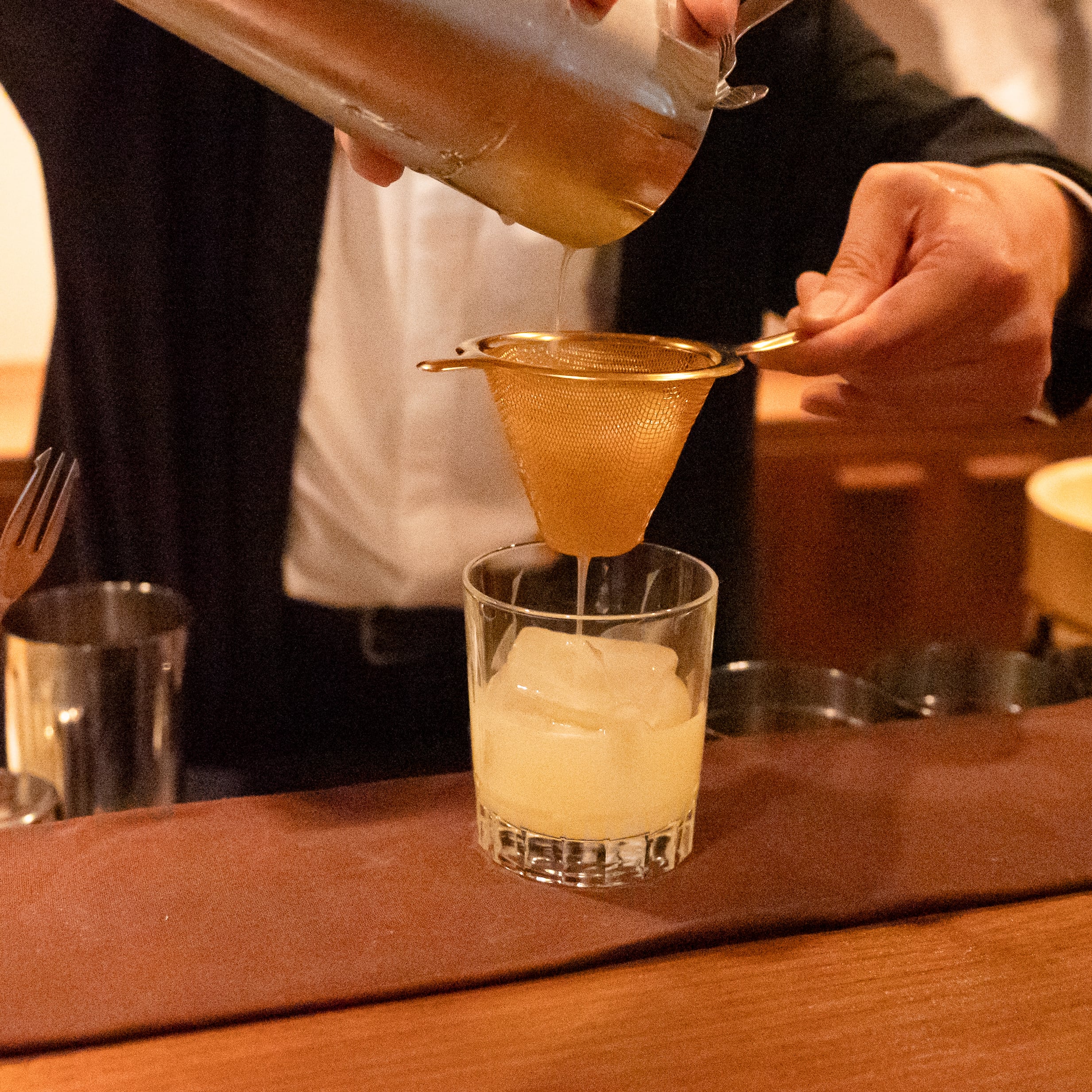 太線メッシュを採用しており、抜群の形状の安定性です。特殊なプレス加工により網の重なりがない美しいメッシュを実現しました。液体が一点に集まり濾されていく流体の動きは、この円錐形の形状により自然と流れていきます。また底面をフラットな形状に、そして交点をスポット溶接することで底面部分の耐久性は一段と高くなっています。バースプーンで果実から濾しとる作業に対して安心の強度、しっかりとかき混ぜながら濾し落とすことができます。