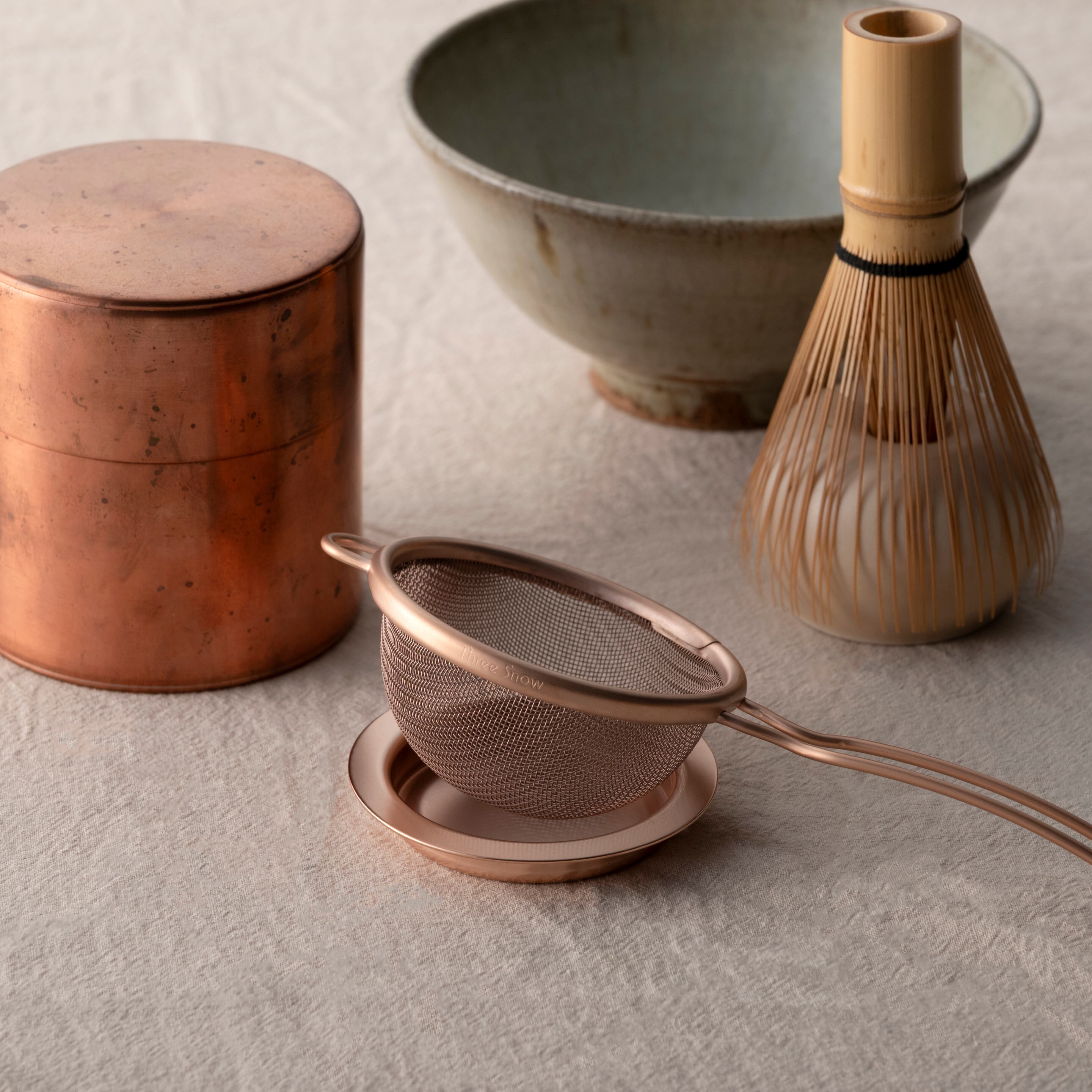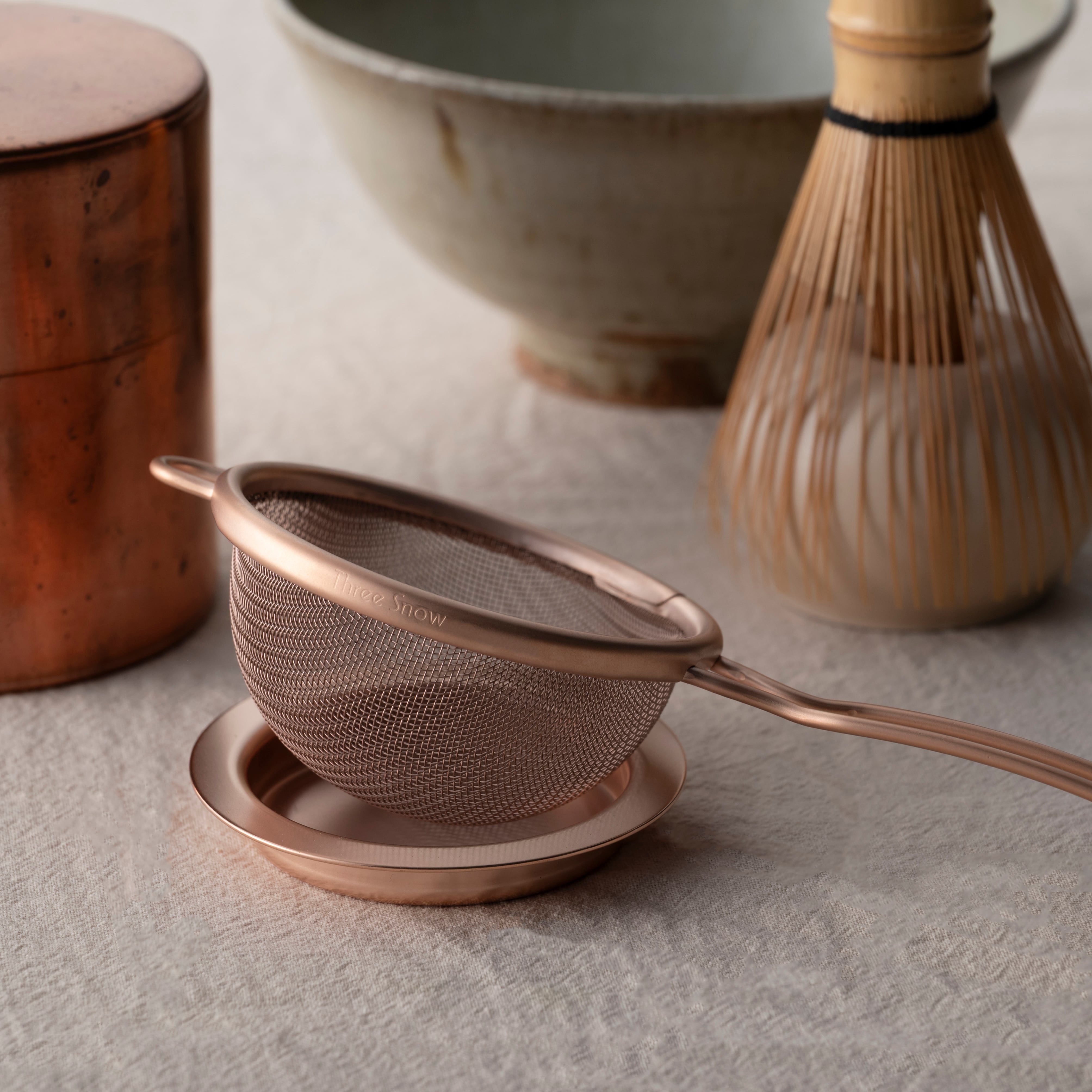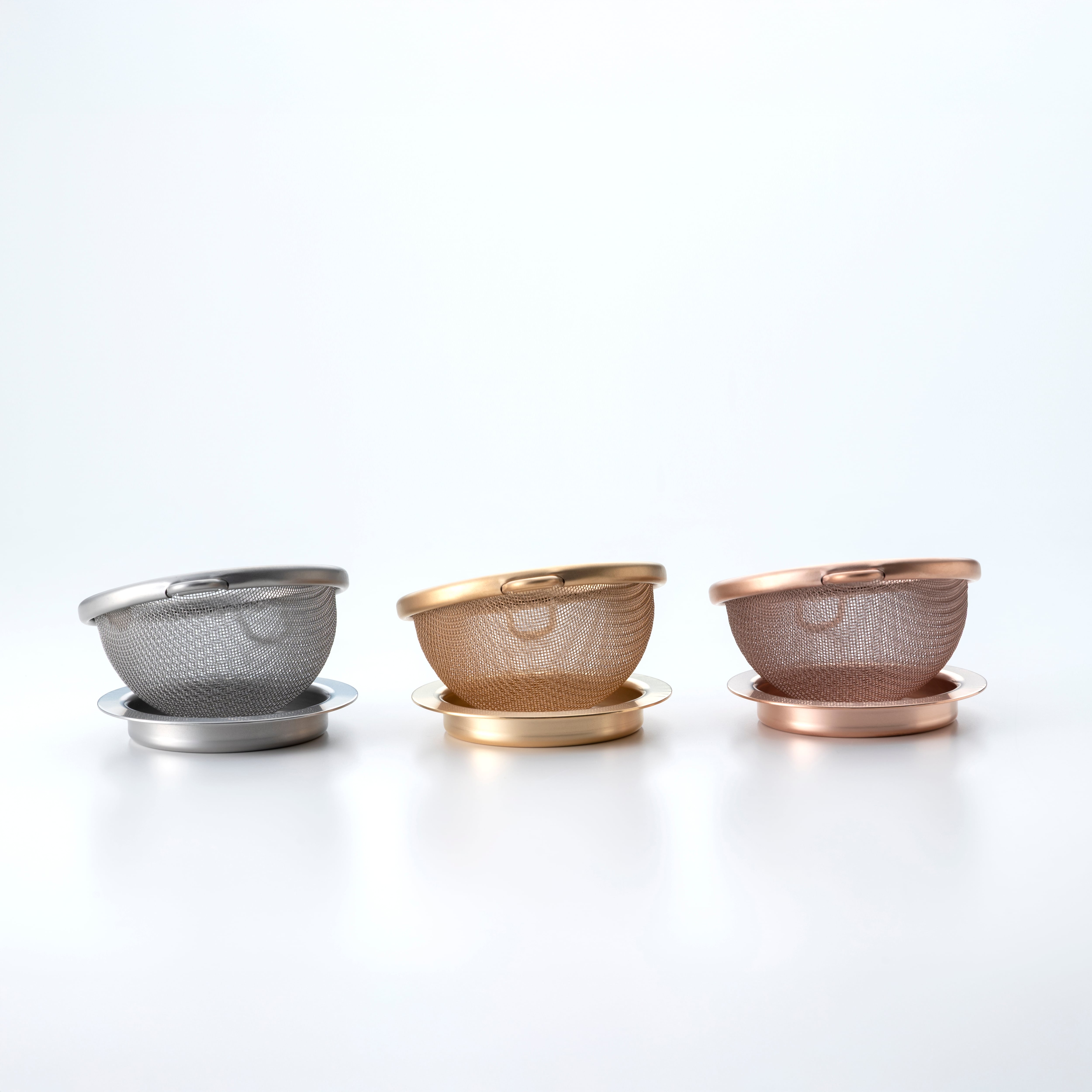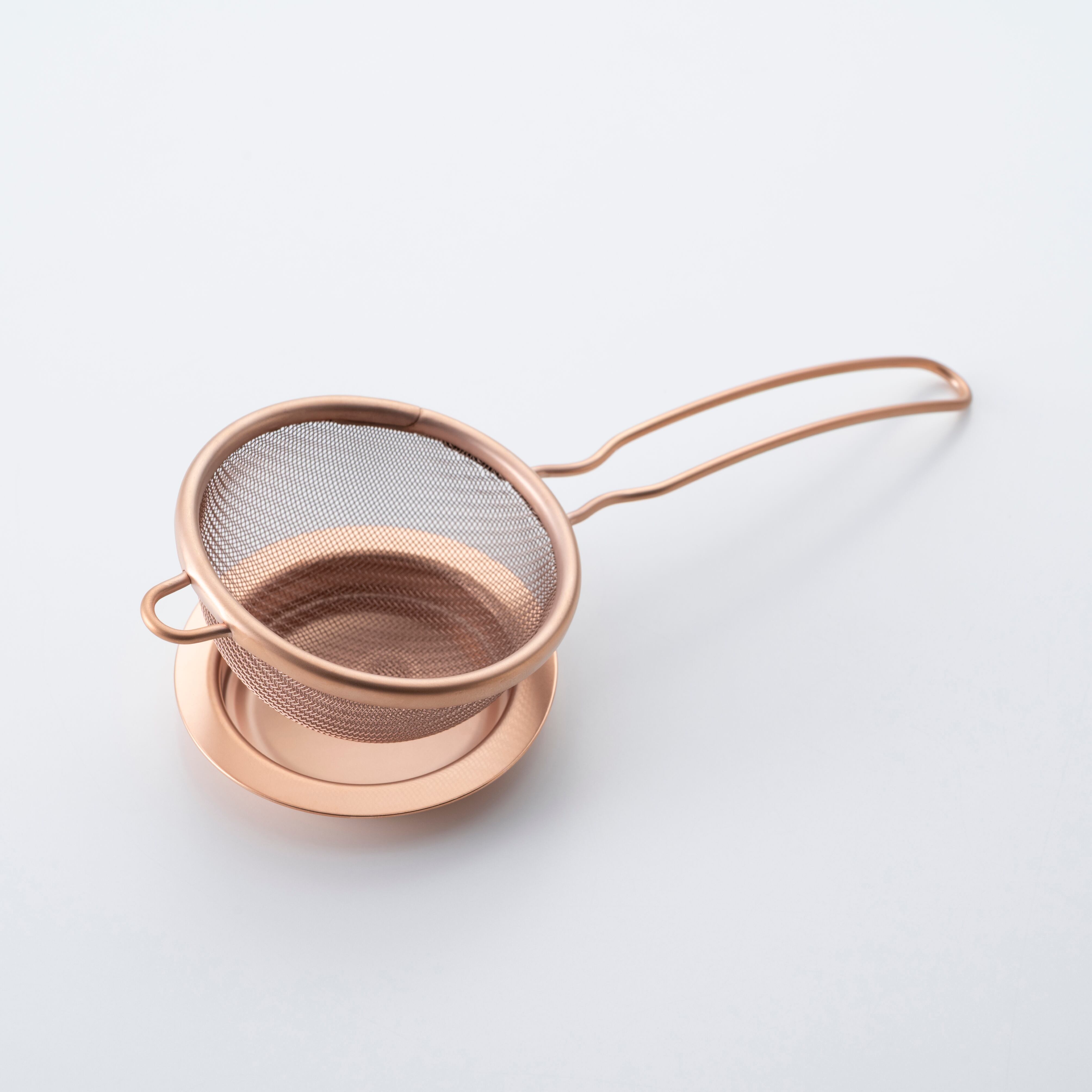 茶こし置き(受け)は茶こしと一緒に使い、常に茶こしのそばにあることで使い手の所作、そして置かれた道具の美しさを引き出します。表面はマット調に仕上げており、さまざまなシーンに馴染みます。カラー展開はオリジナル仕様のシルバーに加え、ピンクゴールド、イエローゴールドメッキ仕上げの3パターンご用意があります。