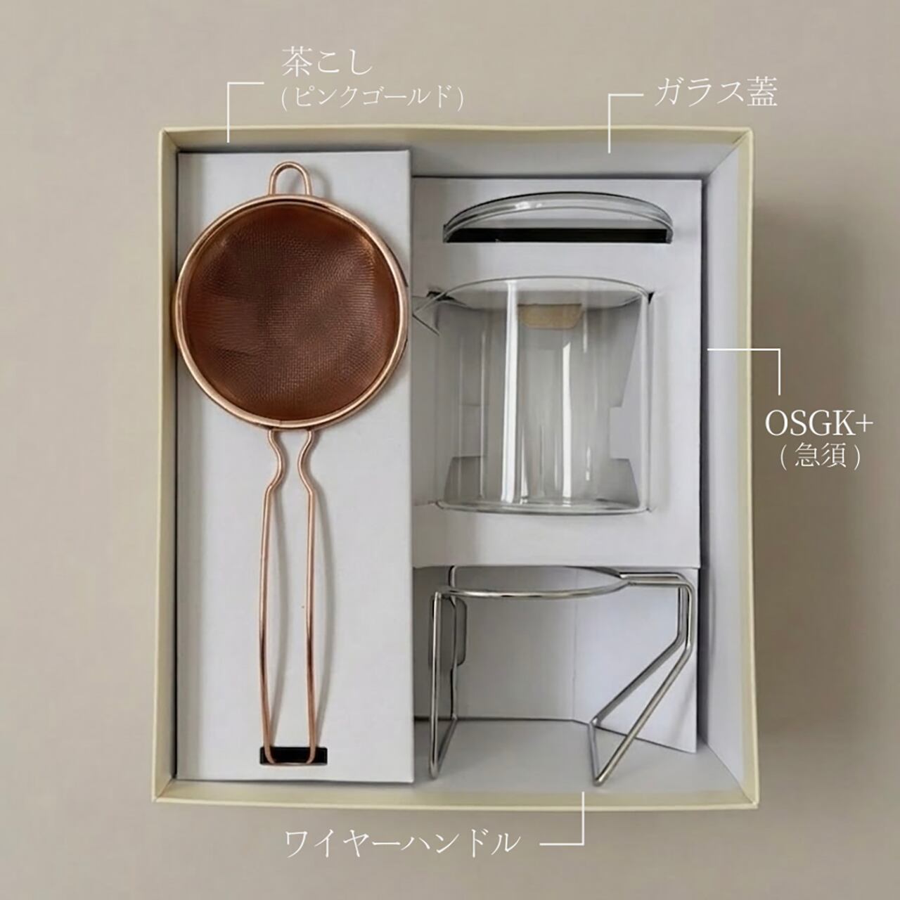 材質:茶こし SUS304/ゴールドメッキ ¦WIRE FLAME SUS304 ¦OSGK+(ガラス急須) 耐熱ガラス ¦ガラス蓋 (LID) ソーダガラス