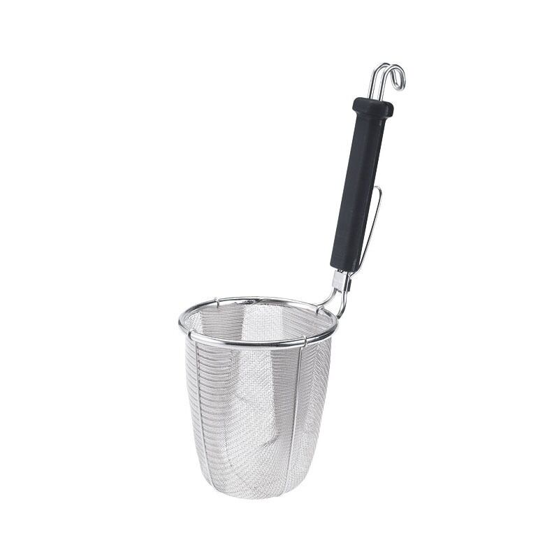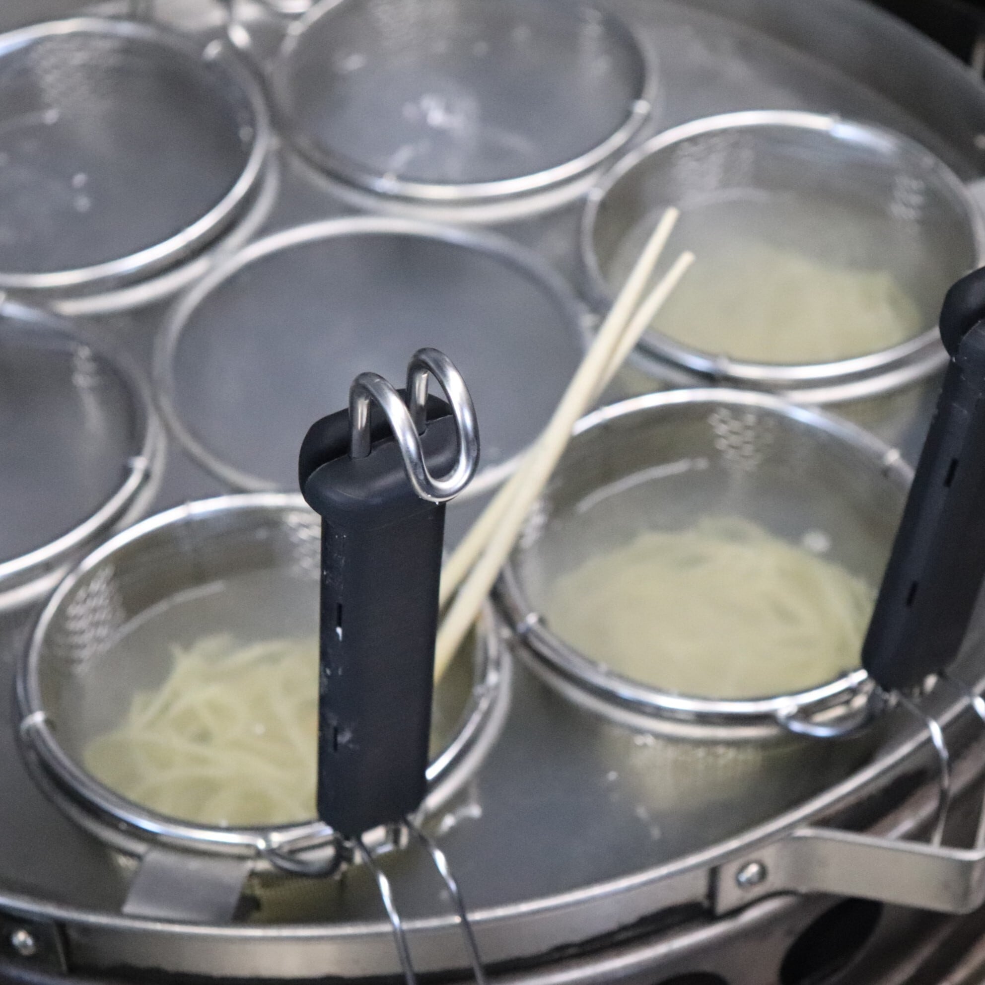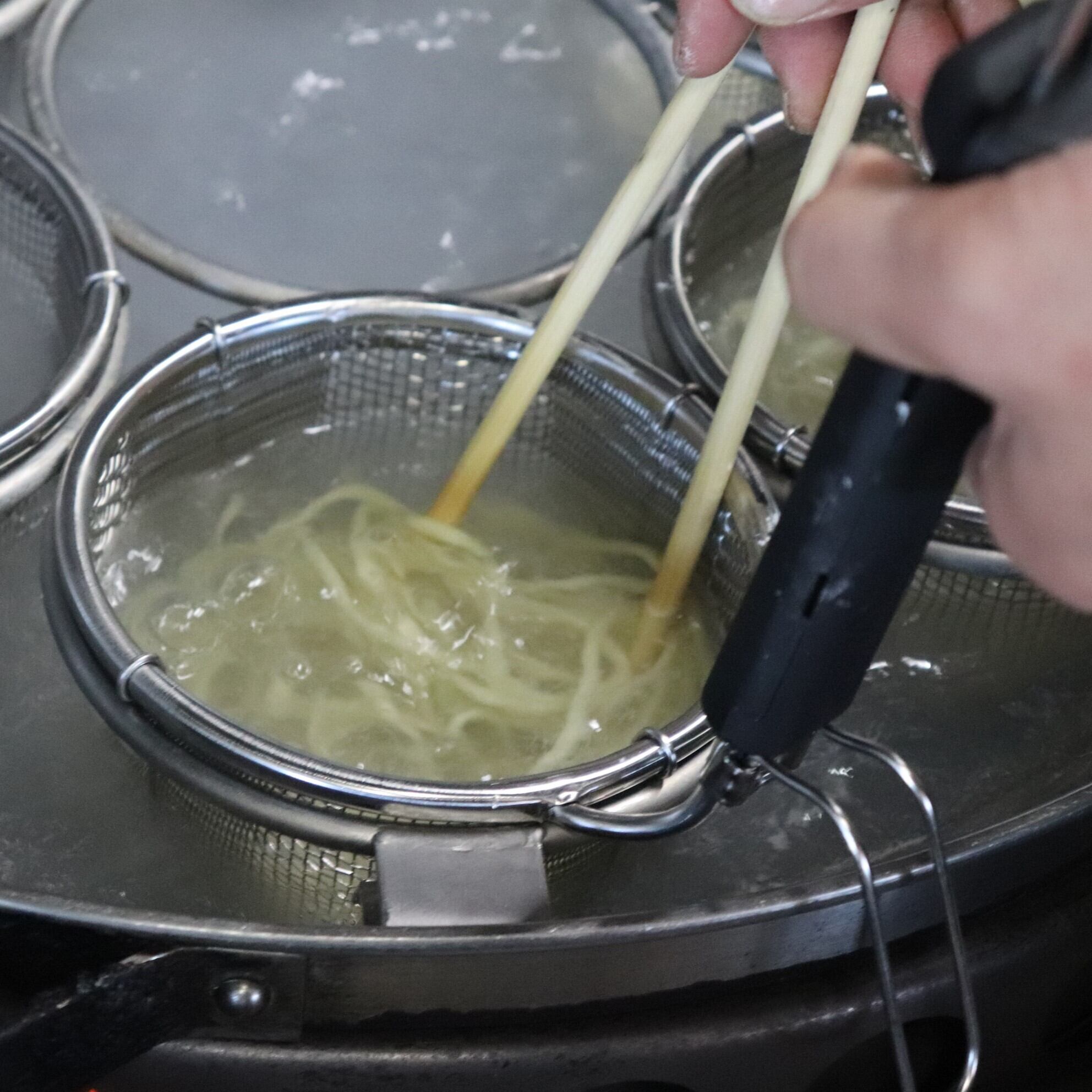 日々の湯切り動作の中で負担のかかるのが、柄の付け根部分。この部分は一般的なてぼに用いられるワイヤーの太さ(3.5mm程度)に比べ、2倍の強度を持つ(5mm)線を使用することで、抜群の耐久性を実現しました。(一般的なてぼの4倍の耐久性)