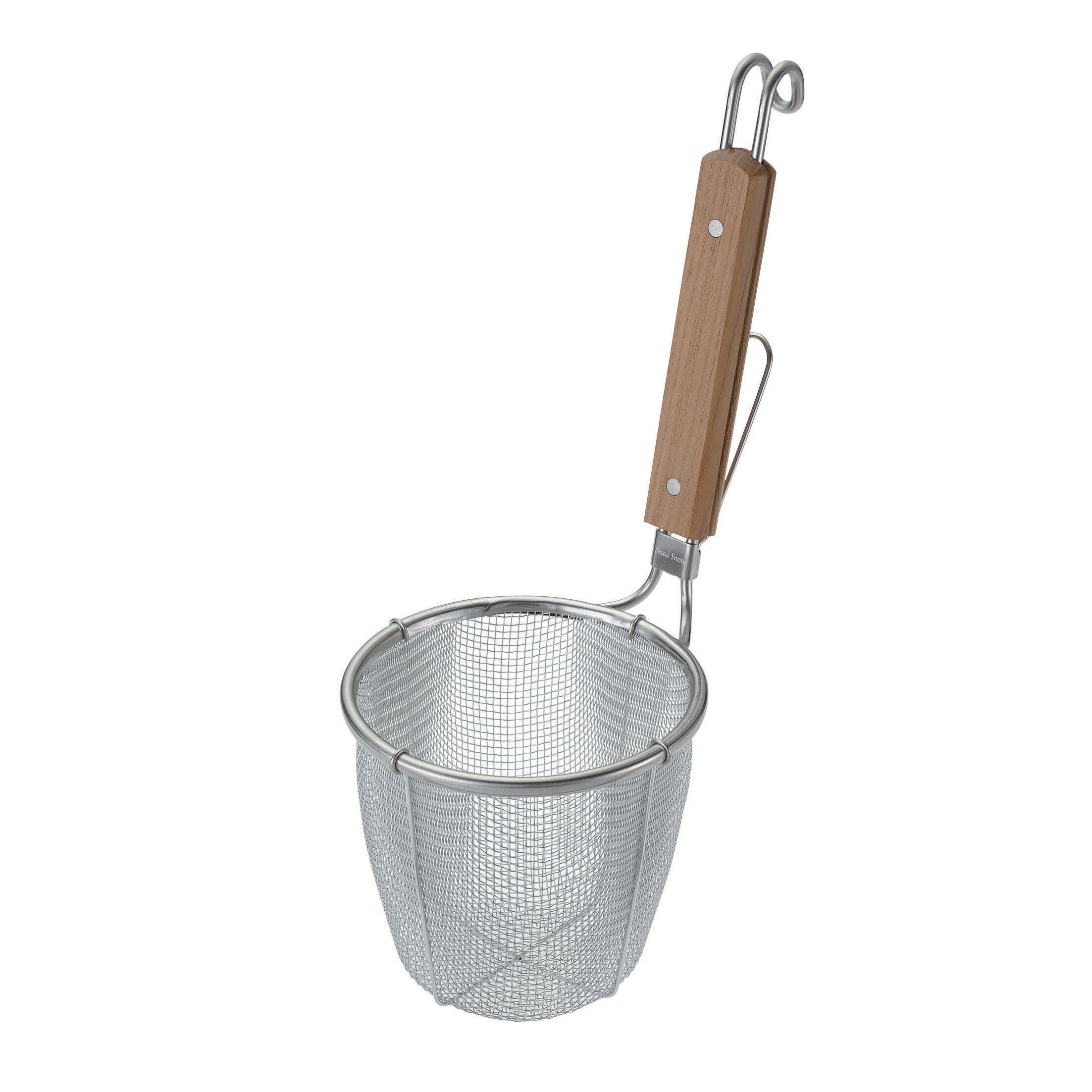 日々の湯切り動作の中で負担のかかるのが、柄の付け根部分。この部分は一般的なてぼに用いられるワイヤーの太さ(3.5㎜程度)に比べ、2倍の強度を持つ(5㎜)線を使用することで、抜群の耐久性を実現しました。(一般的なてぼの4倍の耐久性)