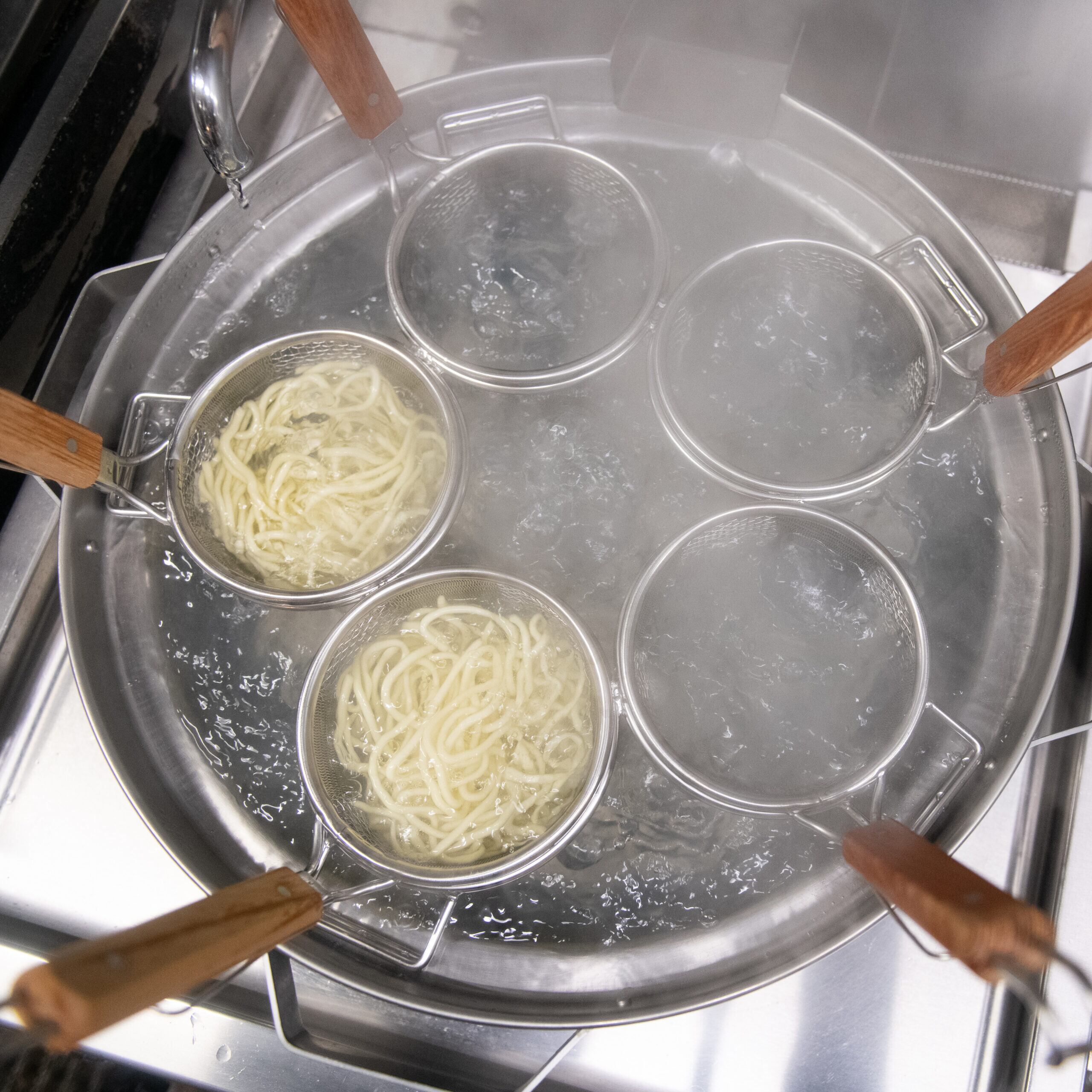 太麺を想定したモデルのため、金網も太く、荒いメッシュを採用しています。通常のてぼに使用する8メッシュよりも1段階荒い6.5メッシュてぼのため、湯切れの良さが特徴です。